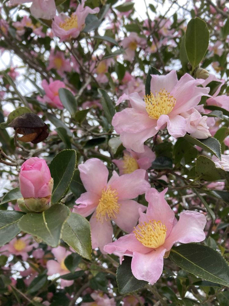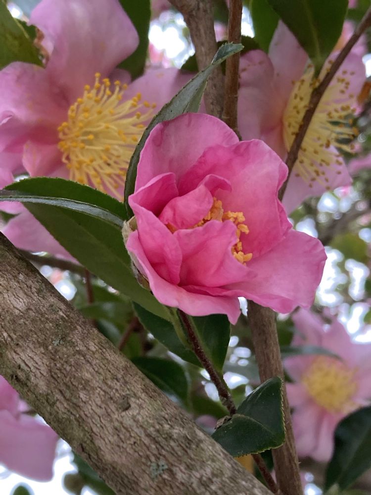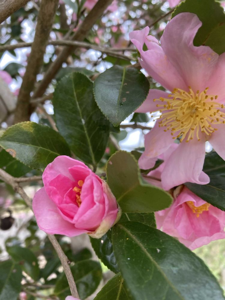遠目に見て、桃色の花が見事に咲いていて八重のサザンカかな?と近づいてみると一重のサザンカでした。
