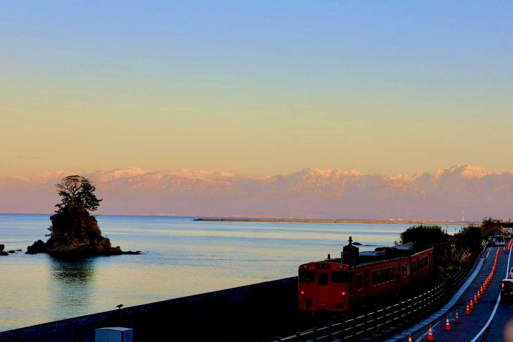 雨晴海岸と遠くの立山連峰のアーペントロートにウットリです。とってもロマンティックです。氷見線のオレンジ色の電車が,風景にとてもマッチしてます。寂しくもあり明日に繋がっていくようでもあり‥