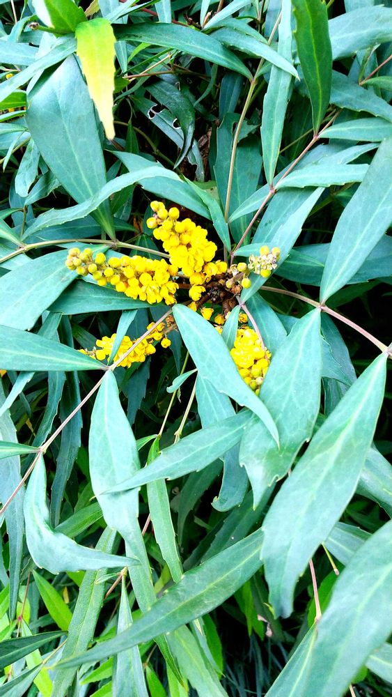 ホソバヒイラギナンテンを撮影した所まるで星形のように花がパッと広がる姿本当に良い発色だなホソバヒイラギナンテンの花は、秋(10月)に穂状に黄色い花を多数つけます。スズメバチやアシナガバチ、ミツバチなどが吸蜜に訪れ、場所によっては多数のスズメバチが集まることがあります。ホソバヒイラギナンテンは中国原産の常緑低木で、メギ科に属しています。特徴は、ヒイラギナンテンよりも小葉が細く全体に小さいことです。細長い葉には鋸歯があり、触れると痛みます。