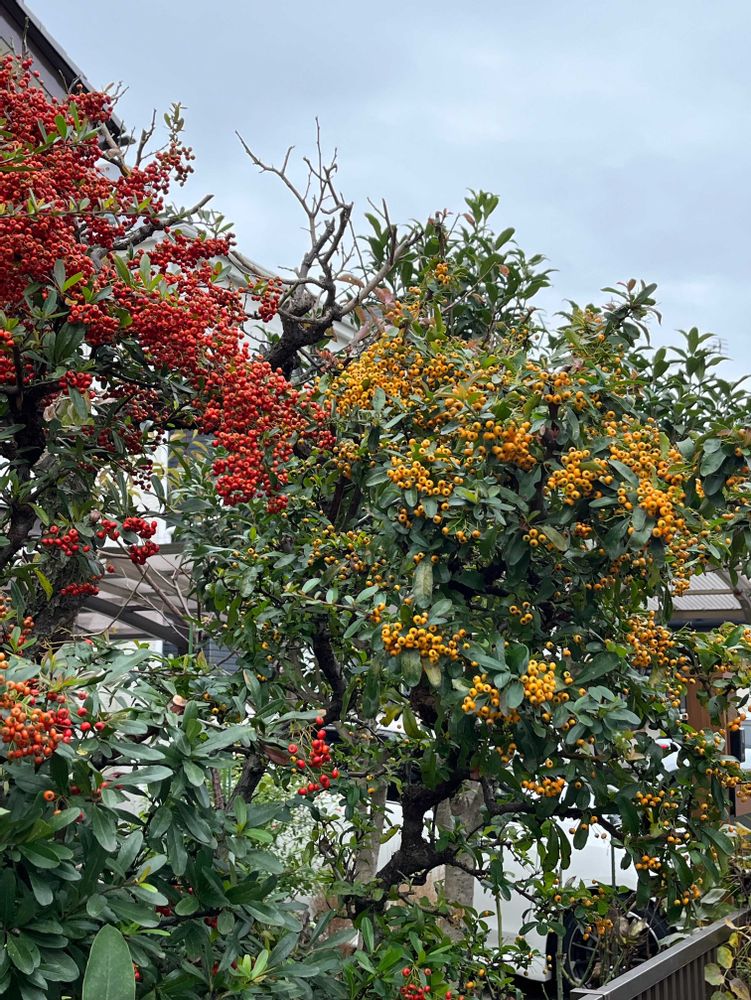 いつもの散歩道のご近所さんの庭に2色のピラカンサが有ります😆👍🔴🟡 トキワサンザシ・タチバナモドキ🔴🟡 素敵です😆👍🔴🟡