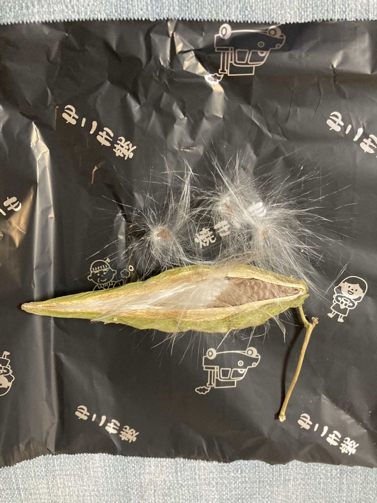 おはようございます☺️ガガイモの袋果ケセランパセラン😳初めて見ました。焼き芋屋さんの包み紙の上に置いてあって、ガガイモの袋果は焼き芋さんで売っている?のではないですよね。珍しい画像、ありがとうございます😊
