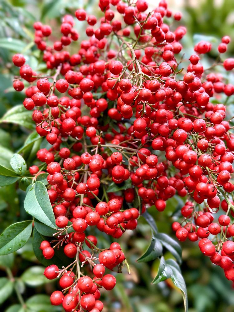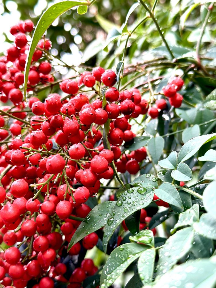 赤いナンテンの実や葉に雫💧が光って綺麗ですね🥰