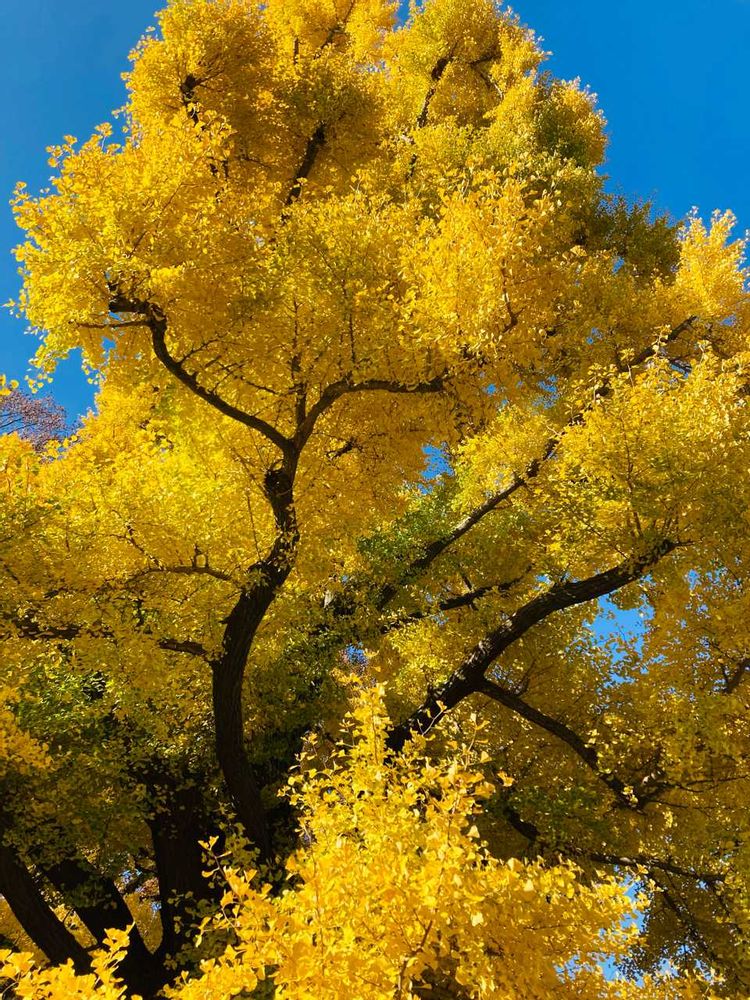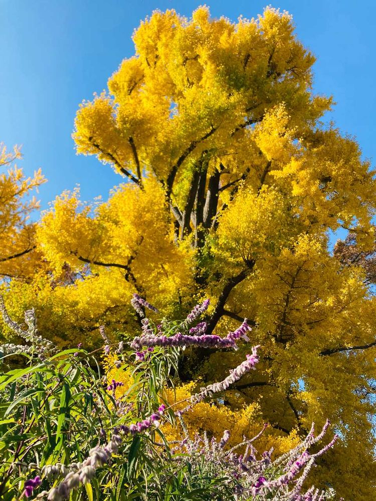 すらりと伸びた細長い茎の先に、紫の花穂が水平に緩やかな放物線を描くように野原一帯に咲き誇り、背景には垂直に聳える金色の銀杏の巨樹とが創り出す補色のコラボレーション世界が素敵でした✨️💛💜💛💜✨️