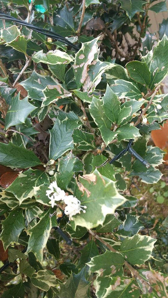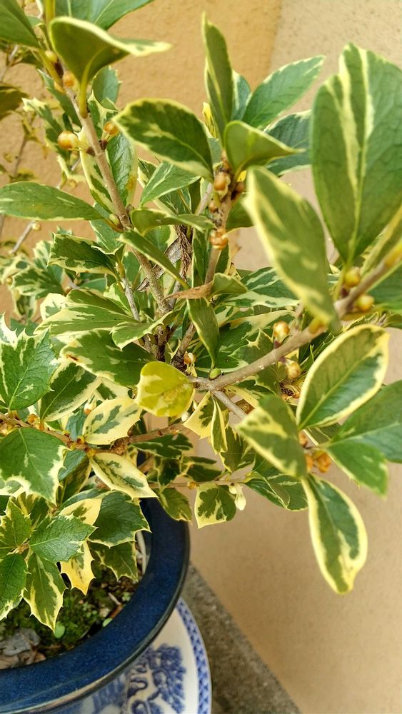 門に置いてありますヒイラギの鉢植えにつぼみがいっぱい‼️