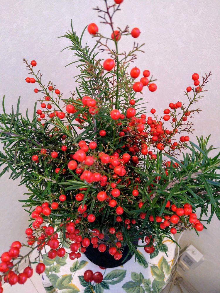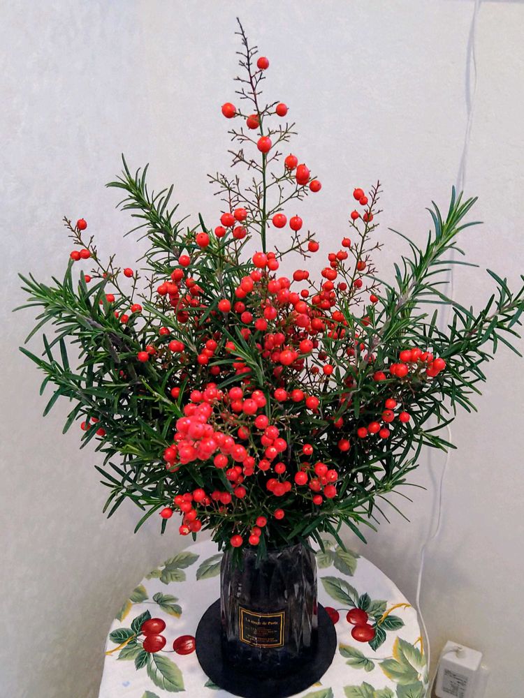 ローズマリーとナンテンの実でトイレの隅をクリスマス気分にしました🌲🎶