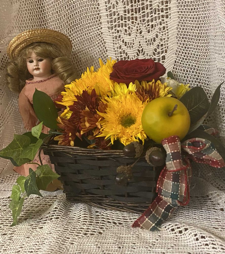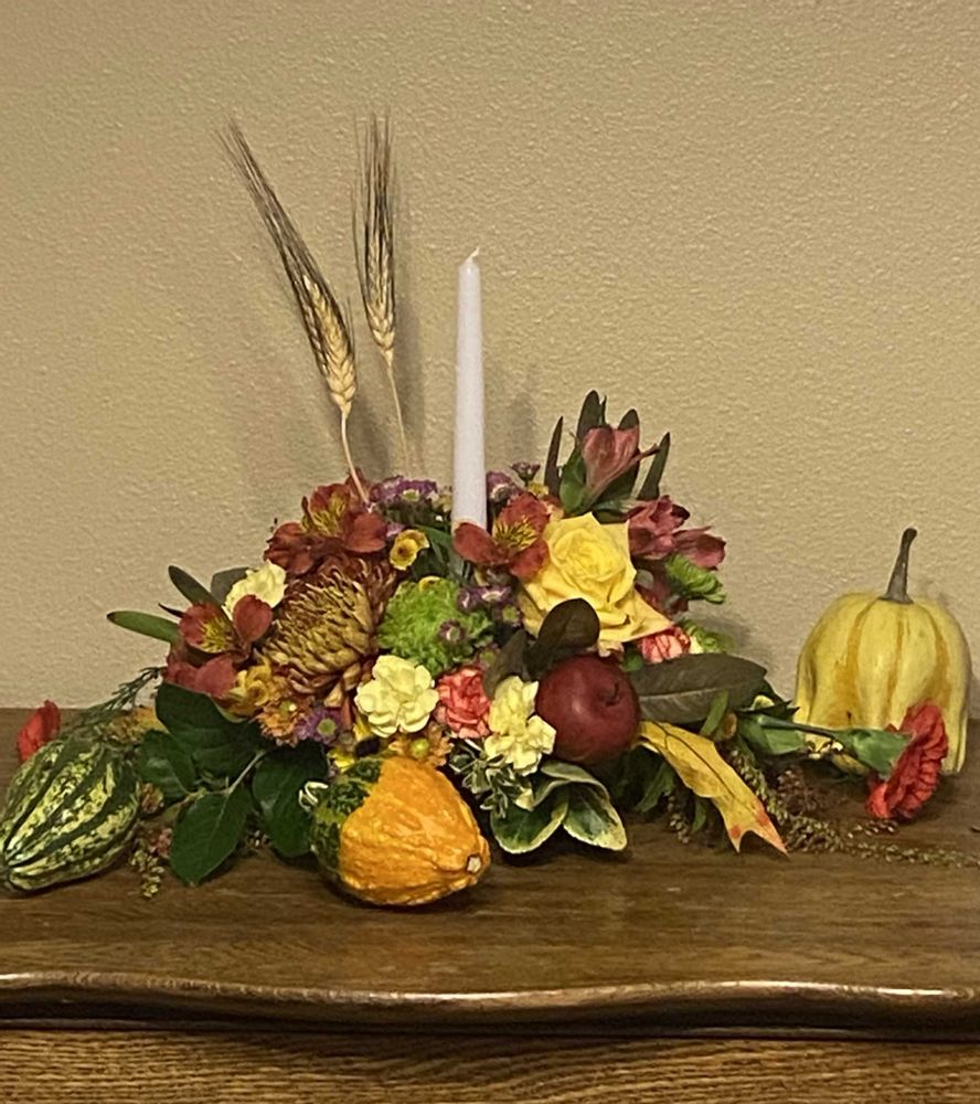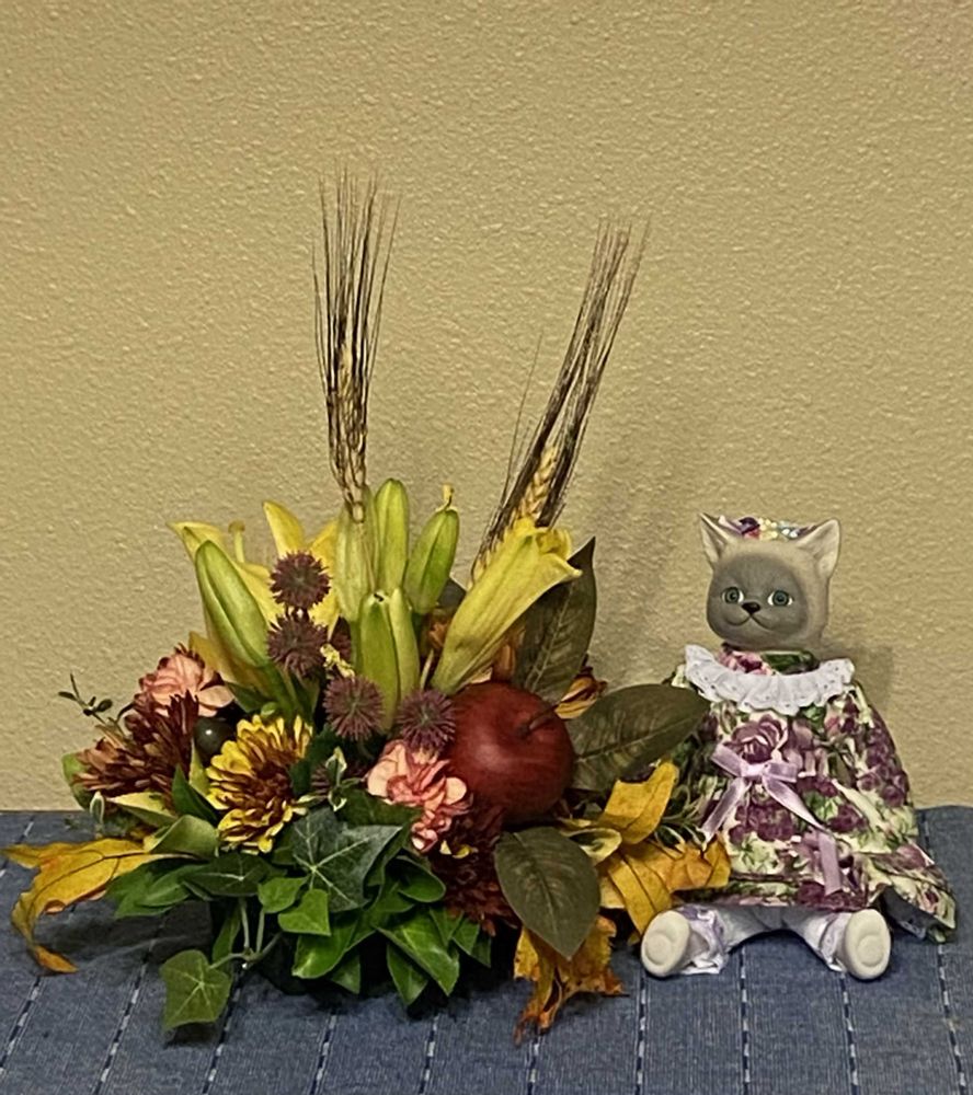 それでサンクスギビングのフラワーアレンジメントとうちのネコのお嬢さん🐈⬛💐