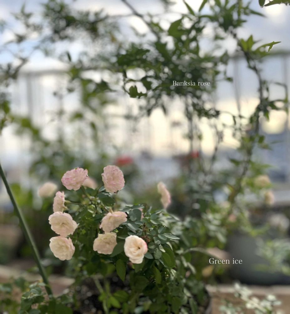 鉢植えのミニ薔薇のグリーンアイスは優しいピンクに💗そして、夏に枯れそうになっていた、地植えのモッコウバラを取り出して一緒にしています🪴いつかはそれぞれにしますが、元気になって良かった✨