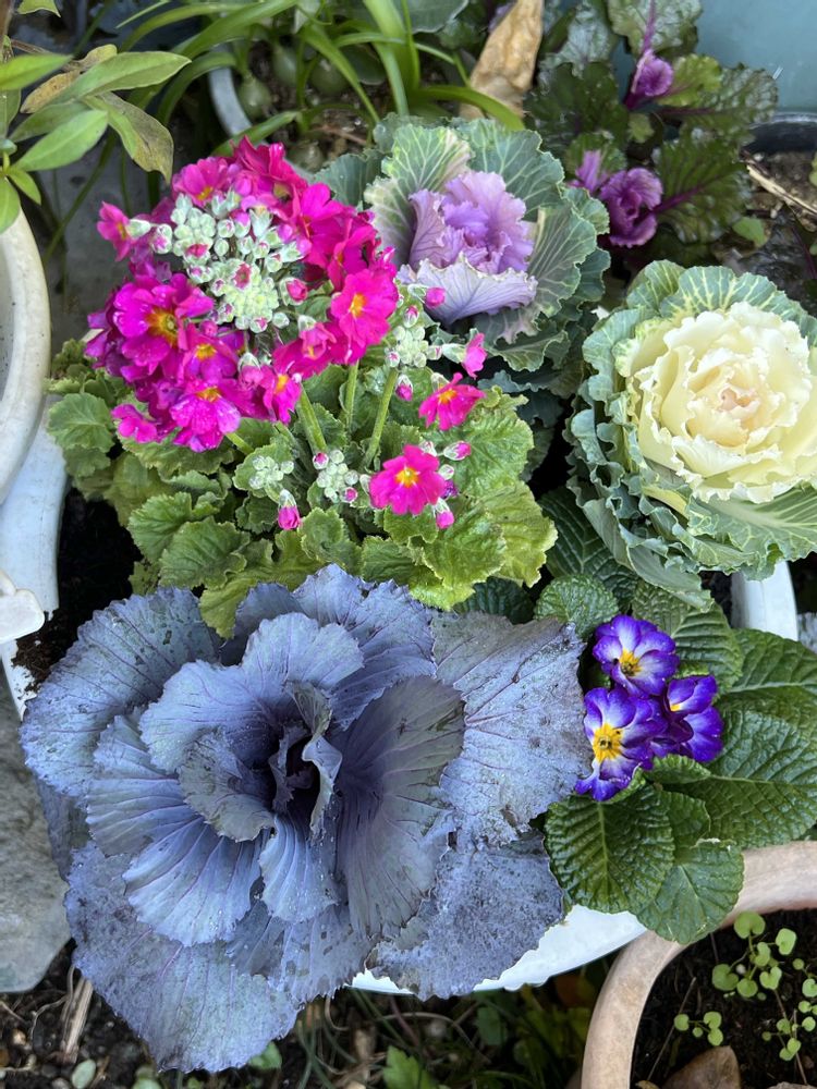 母屋の玄関前の葉牡丹と桜草の寄せ植えです