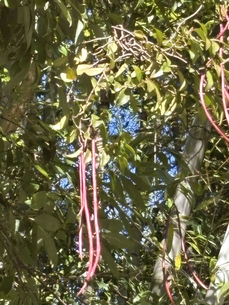 高くて近づくことが出来なかったのですが、この赤くて長いササギ豆のようなのは、テイカカズラの実でしょうか?図書館の垣根で見た実は10㎝ぐらいの短いものでした。自生の