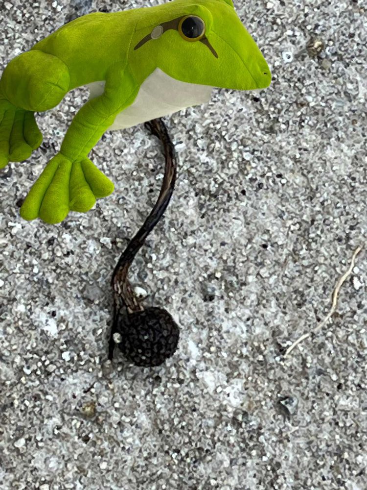 落ちた実がカエルさんと繋がって見えて、一瞬空気を入れてぴょんぴょん跳ねるゴム製のカエルさんに見えました🐸 👀?