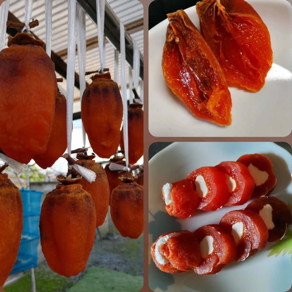 ③干し柿が綺麗に出来上がりました✌️クリームチーズを巻き込んでオヤツにいただきました😋