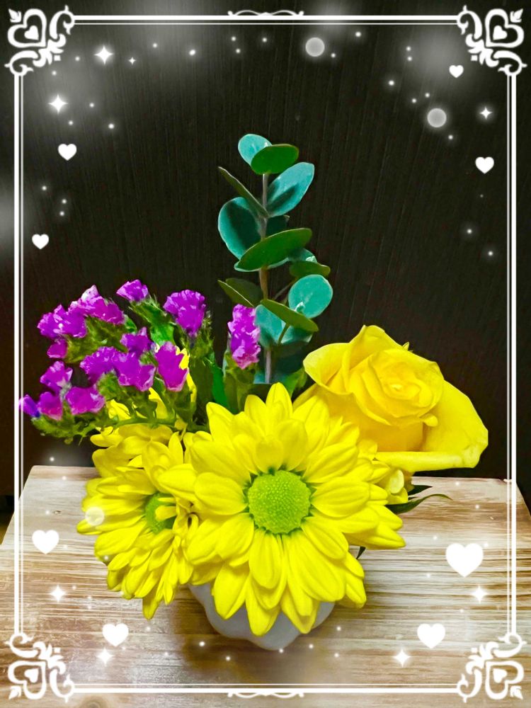 成る程、濃いグリーンの葉を持つユーカリが森を、そして、鮮やかなイエローの薔薇とスプレーマムが美女をイメージしているのかな👀♪