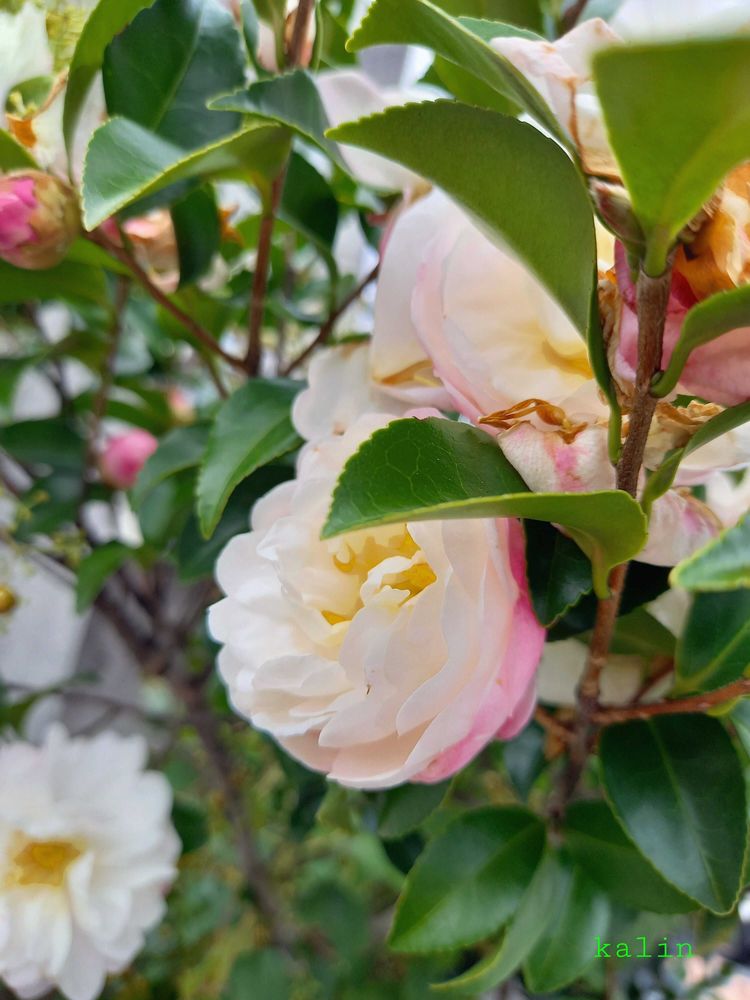 ほんのり桃色を帯びた白い花びらのサザンカが愛らしいですね〜🤍🩷🤍