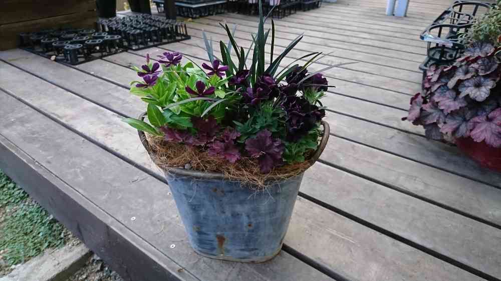 前半戦最後はブリキ鉢に植えた真っ黒な寄せ植え