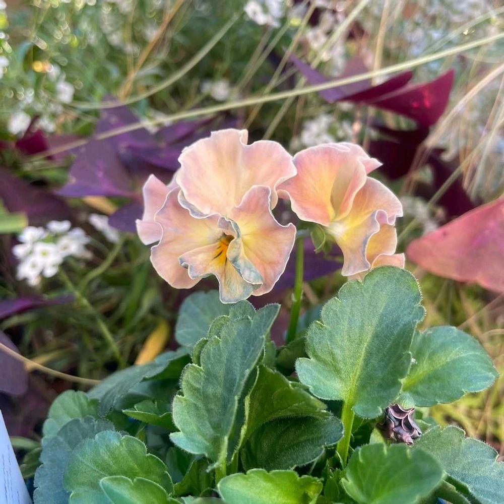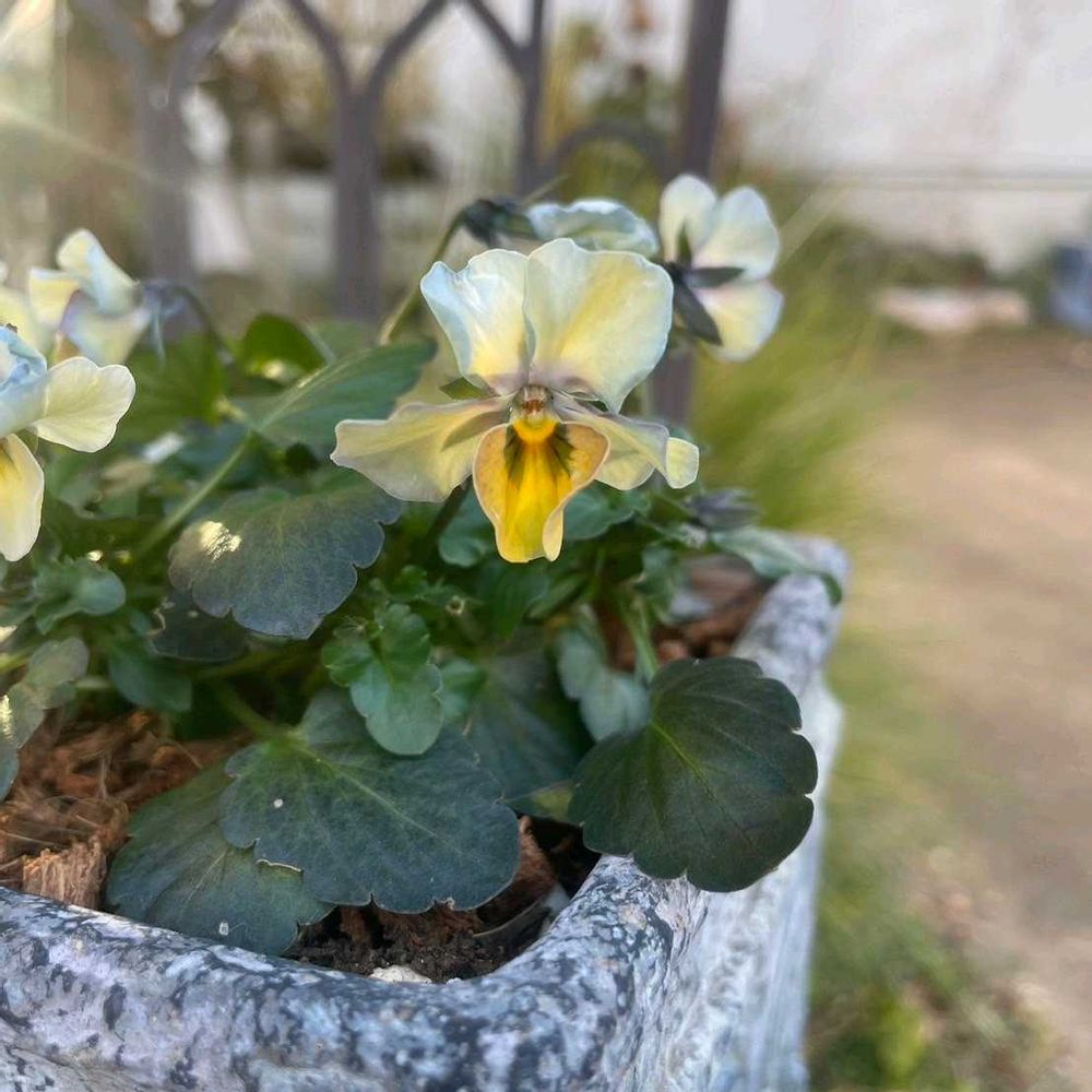ビオラって寒さで紫化しちゃうのあるあるだけどイエロー系なら大丈夫よねきっと🤭ニュアンスイエローに中弁が反った姿が可愛いです🎶