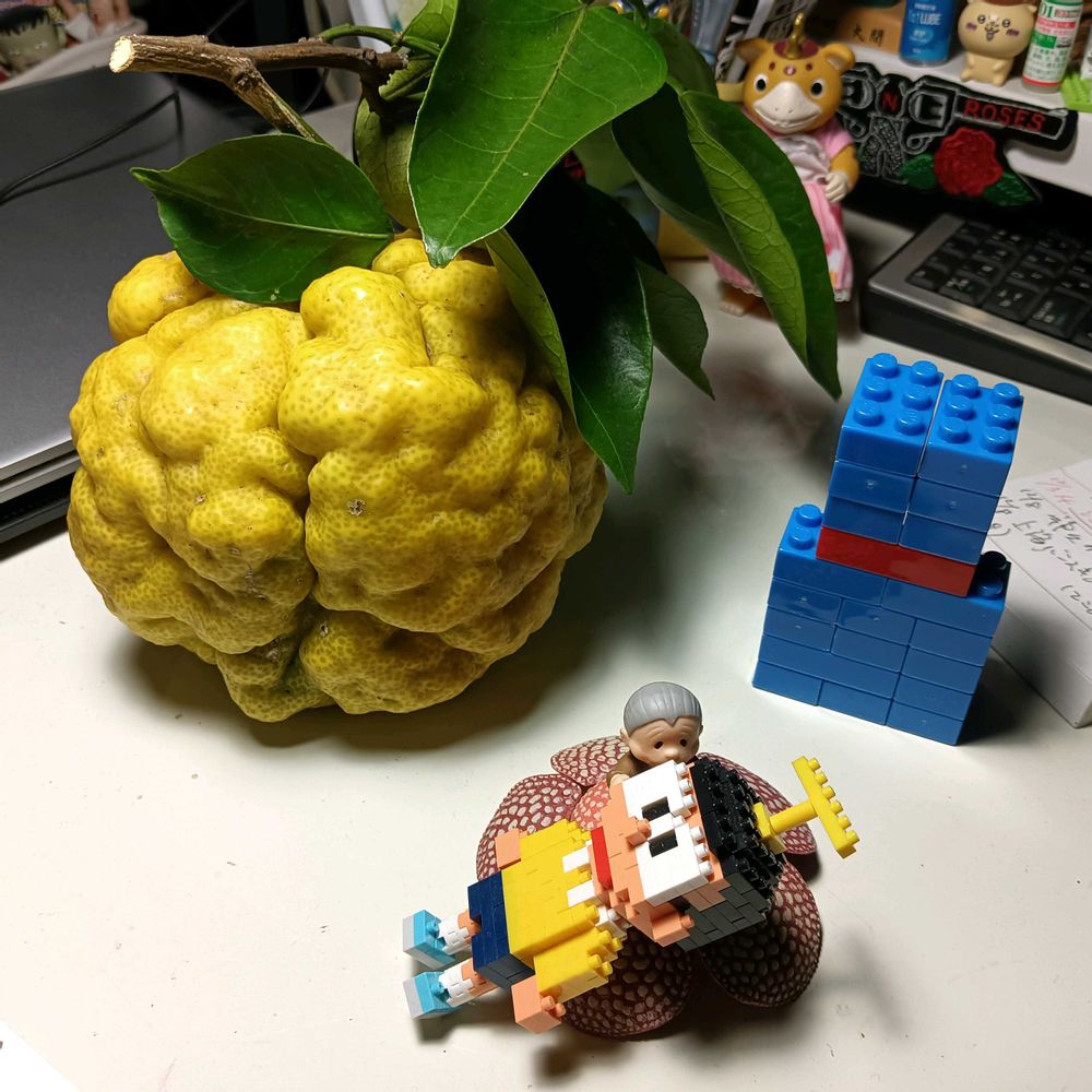 ブックオフで550円で買ったのび太と、ガッツで自作した後ろ姿のドラえもん。あとご近所さんから頂いたジャイアントゆず。