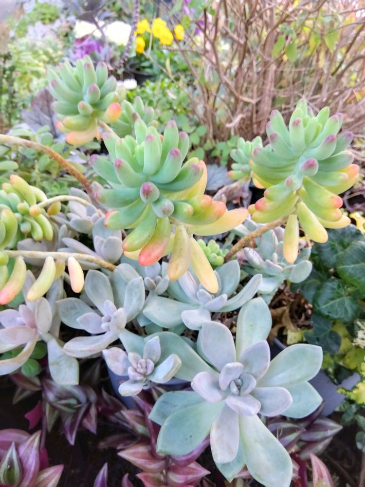 今朝の写真は、昨年の春にカット挿ししました乙女心と葉挿ししましたジュノンボーイの鉢になります。