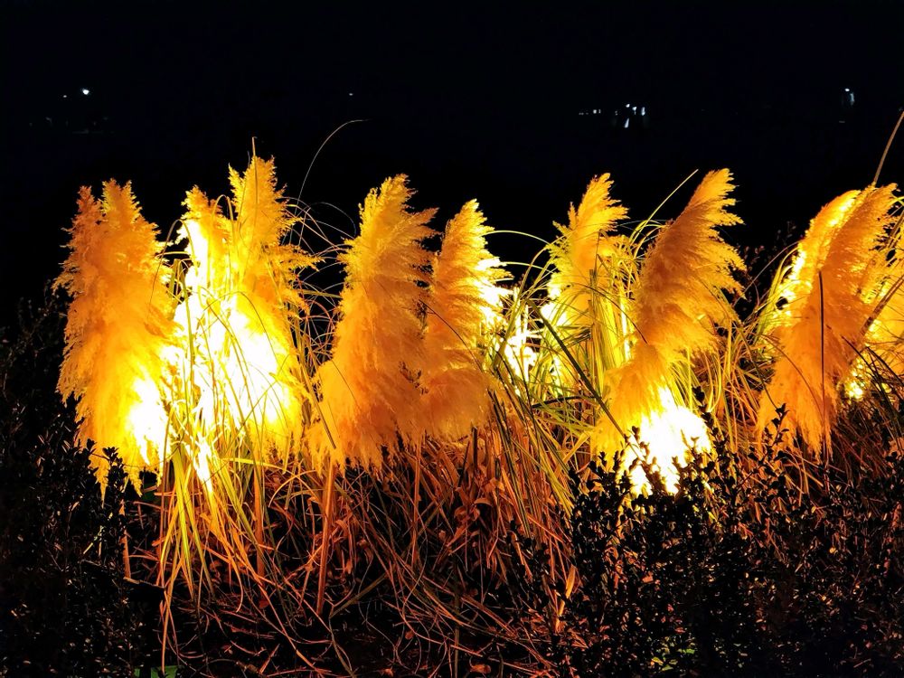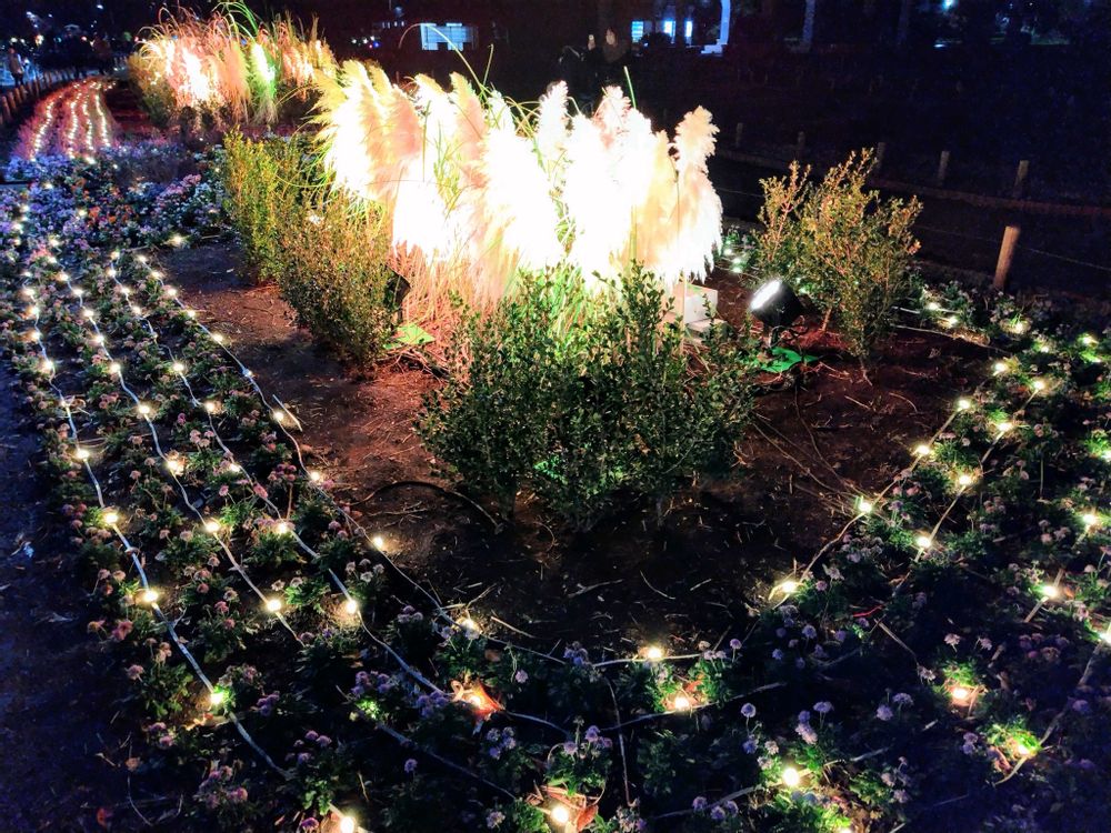 背の高いパンパスグラスの手前にストックやビオラなどの一年草の花が植えられていて高低差をいかしたライトアップになっています