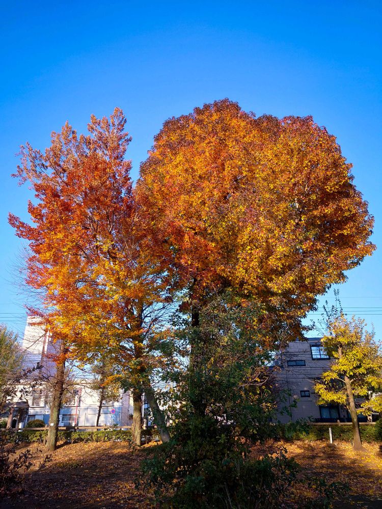 見た目の形は違いますが、2つともきれいに紅葉していました🙌 たしか、片方はトチノキだったと思います🤔(農業試験場内にて)