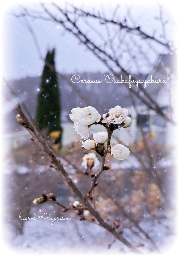 大阪冬桜の小ぶりな八重のお花に、雪がちらちら降りかかっています