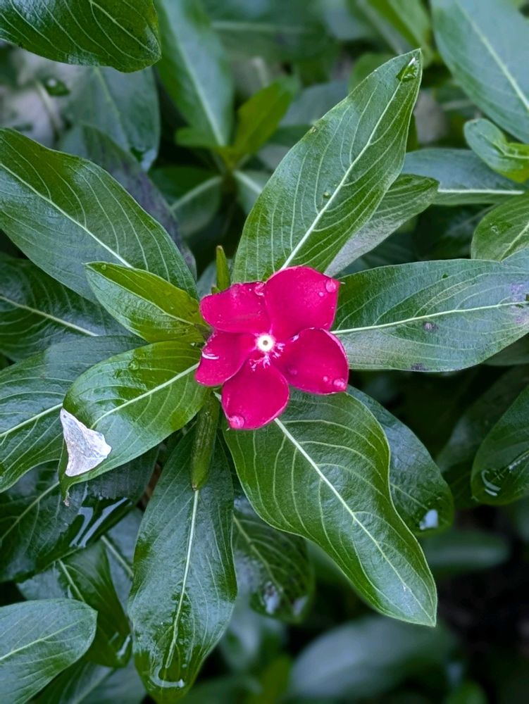 ニチニチソウ、真っ赤なお花と鮮やかなグリーンの葉っぱ、どっちも艶々と輝いて素敵ですネ。😘