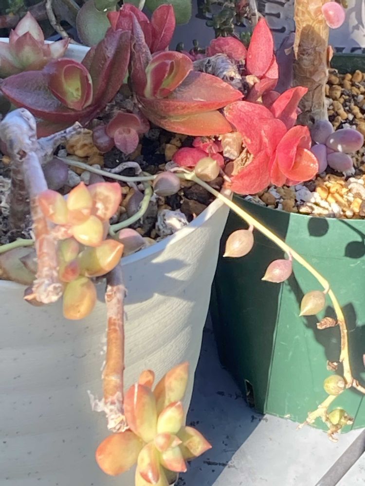 pic2 実家の雨晒しゾーンにいる小さな寄せ植えのグリネさんは、年中日光浴のため、ほんのりと紅葉しています🍁