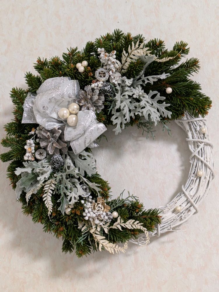 もみの木&シロタエギクのフレッシュクホワイトリスマスリース…🌲❄️⛄