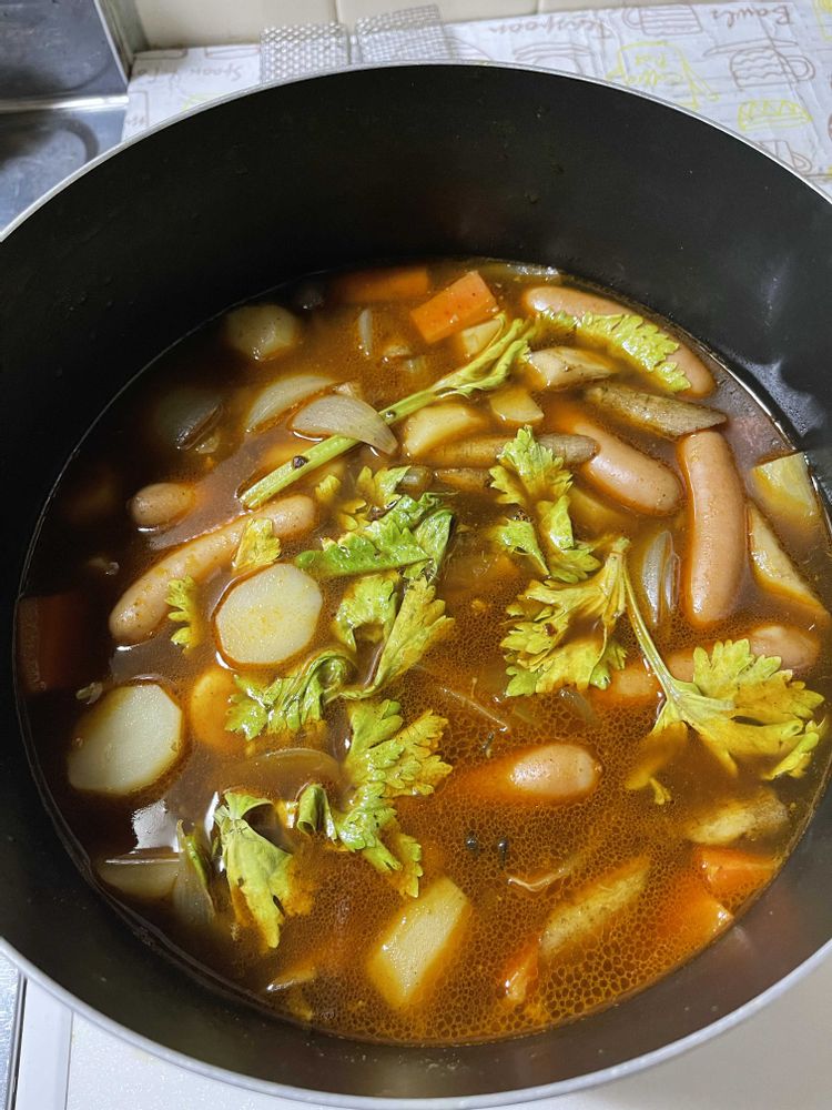 🧄 🧅 🥔 🥕 🥦 🍄🟫 牛蒡 セロリ と燻煙ウインナーで、味付けはコンソメの粒と塩胡椒のみです♪ (あっ‼︎ キノコはマッシュルームではなくて平茸ですけど..😆)