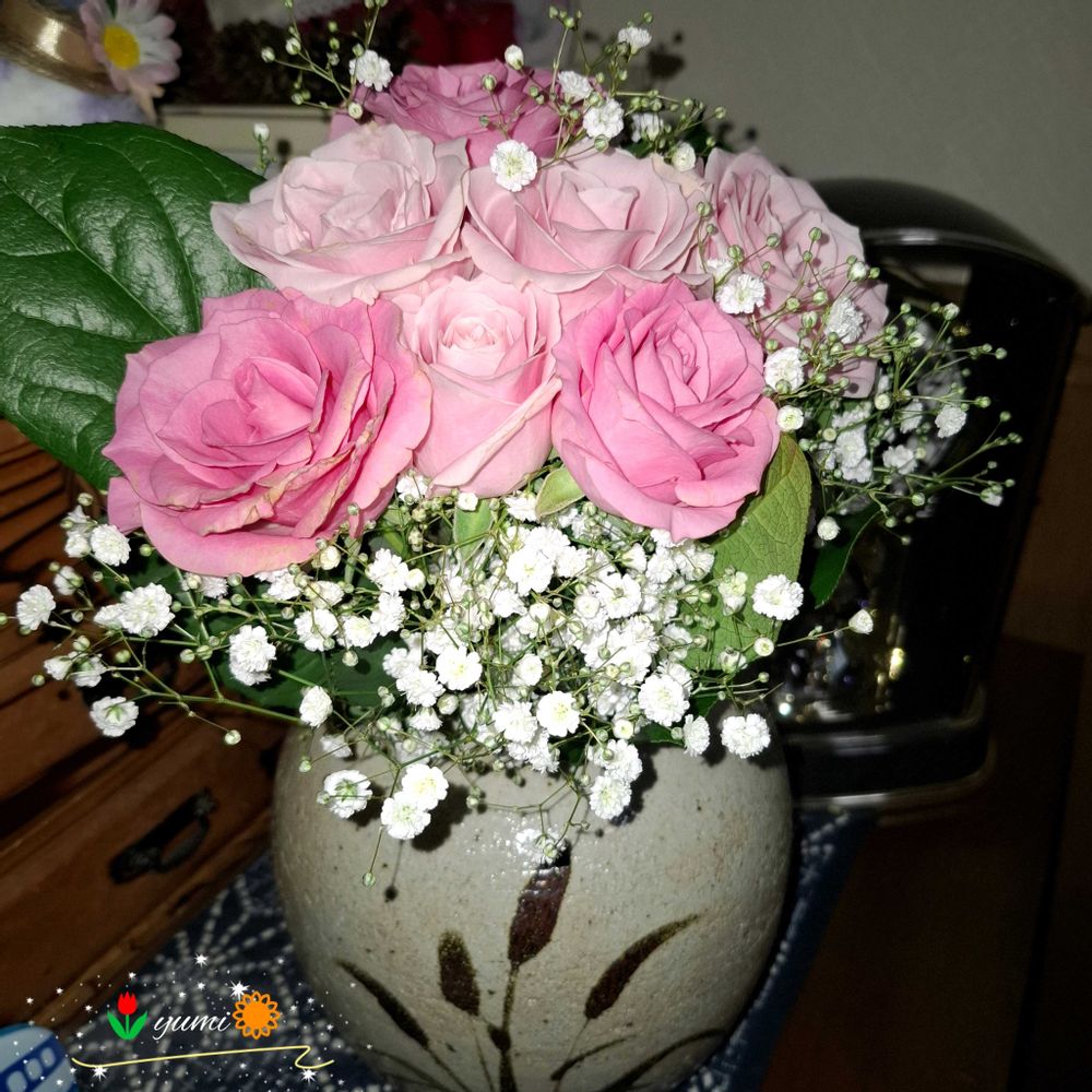 優しいピンクのバラとカスミソウ😍娘さんの雰囲気に合わせてプレゼントされたのでしょうね🥰