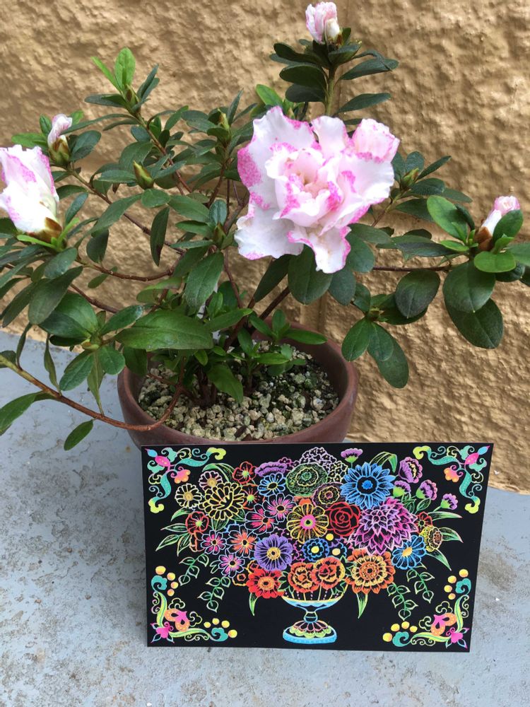 スクラッチアートは100均の「花の世界」というシリーズです。削り方によって 個性が出るし、何色が出るかわからないのが ちょっとスリルあって面白いですよ。