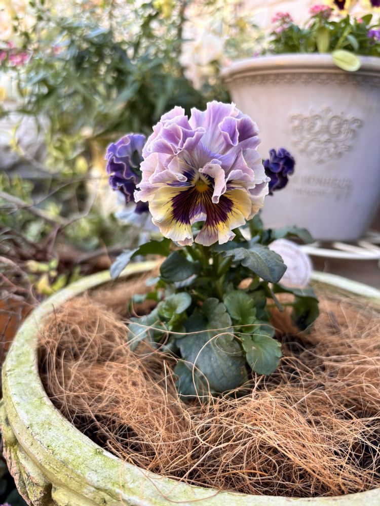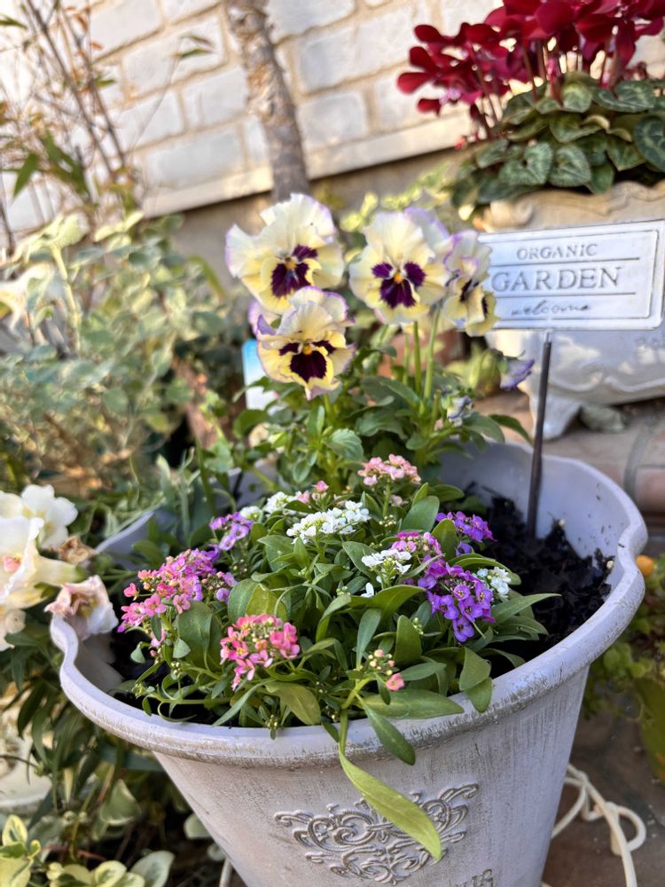 パンジー パルムディールは、お一人様でゆったり。天の羽衣はアリッサムと。玄関前が華やかになりました🥰