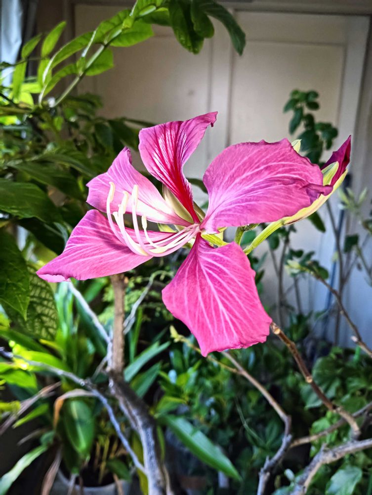 オオバナソシンカ(ホンコンオーキッドツリー)が開花しました。ソシンカ類の中でも特に濃いピンクで花も10cm以上あり葉も大きく香港市の市花木にも制定されています。こちら日本では種も付かず挿し木も困難なので繁殖方法は取り木になります。一説によるとムラサキソシンカとフィリソシンカの交雑種だとされていますがたしかに両方の特徴がよく現れております。ちなみに沖縄でも需要がなく生産者がほとんどいないので3年以上かけて探したレアな苗木で本来は植物園の温室にしかありません。そして沖縄の熱帯植物を育て始めて5年になりますが本土の植物と違い謎だらけなのでそこが面白いです。そしてただいま沖縄の熱帯植物が70種類を超え冬は室内で気温と湿度を保ちサーキュレーターで空気を循環させて室内だと上から光が入らないので補助光としてLED植物育成ライトを2台設置して足りない光を補っております。