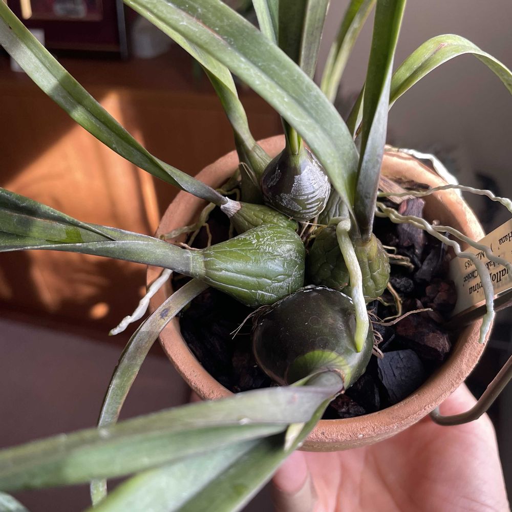 左のバルブの葉と葉の間から出ている白っぽいものです。