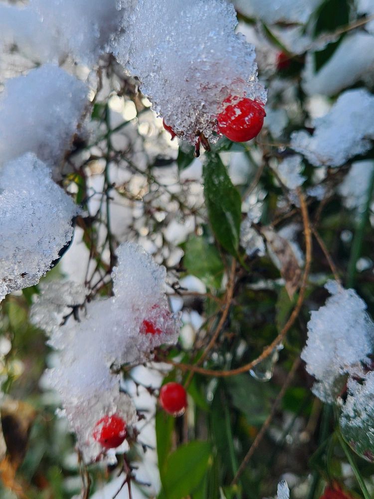 地面より植物ܾ ܾ 𖥧𓇣𖦥𖥧𖥣などに重たい積雪❄で可哀想ですね。特に南天の枝は地面に着くほどしなり折れそうで雪を落としてやりました。