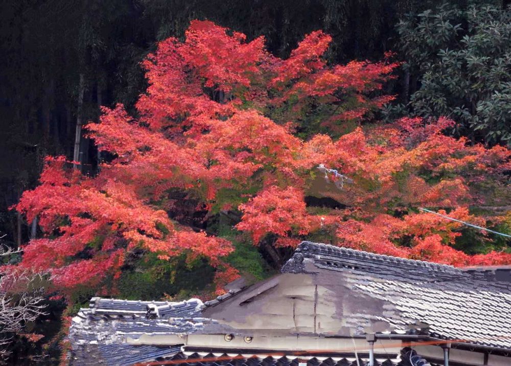 ベランダからzoomで,山の中腹のお宅の紅葉,大きな紅葉の樹木の投稿画像
