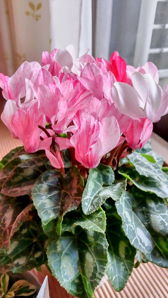 ホームセンターで出会ってしまった 斑入りのようなピンクのシクラメ和っぽい シクラメン この色は 初めて見ました 放ってはおけず お迎えしました😊💕