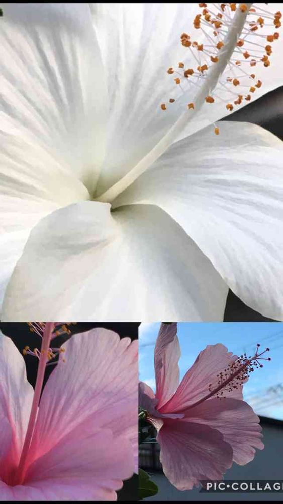 同じ鉢の中で白いハイビスカスさんと薄ピンクのハイビスカスさんが仲良く咲いていました〜〜昨日の夕方の撮影