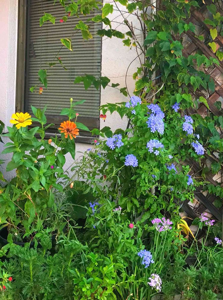 酷暑に 咲く 花たち 百日草 ルリマツリ