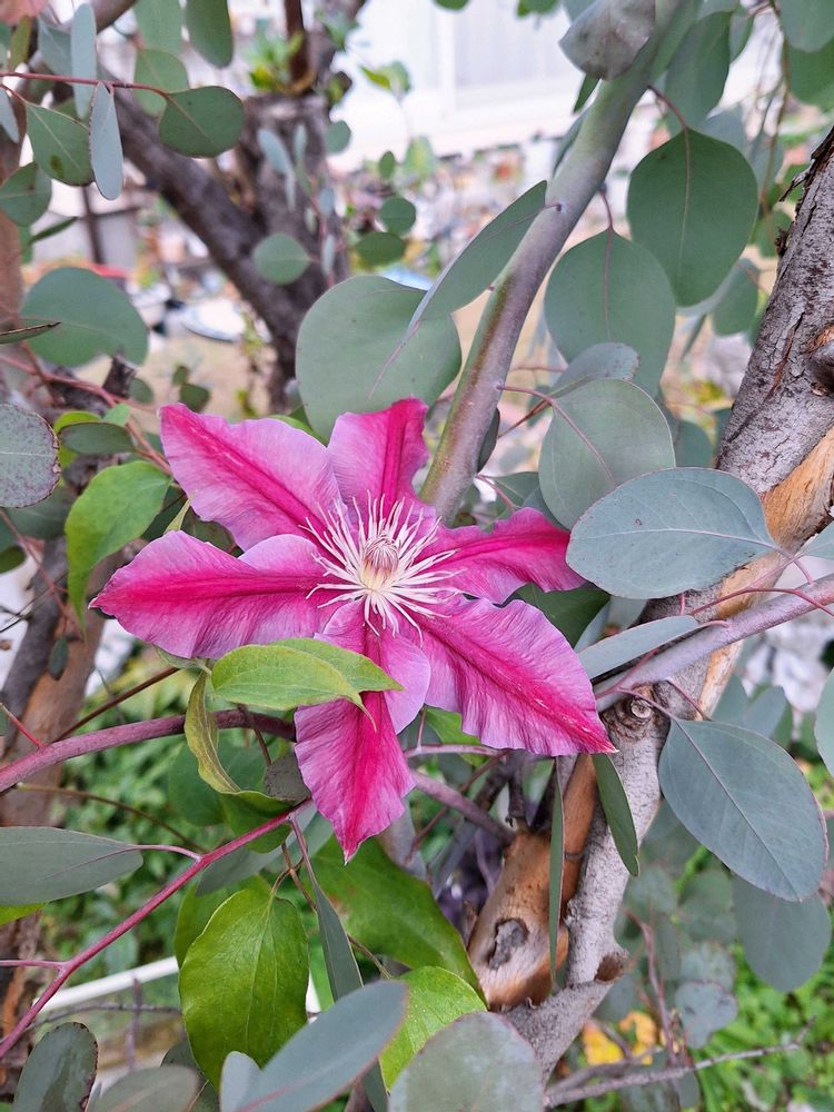 ③庭のユーカリポポラスの木に巻き付いて、クレマチスが今頃咲いていました❗😃