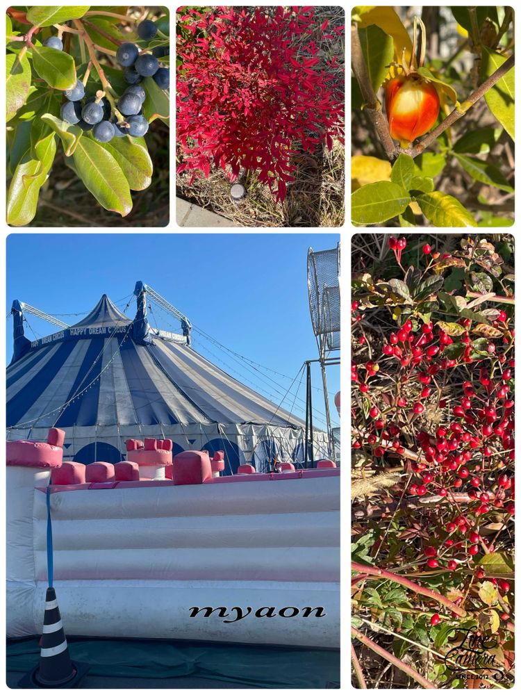 1枚目:ジ アウトレット湘南平塚で開催されているハッピードリームサーカスに音楽会の代休でお休みの孫ふたり&娘と行ってきました🎪サーカスを観るのは初めてだったのでドキドキ、ワクワク❣️笑いアリ、スリルあり、感動アリの楽しい2時間でした❣️アウトレット内の植物左上から↖️シャリンバイの実、南天、クチナシの実、ノイバラの実