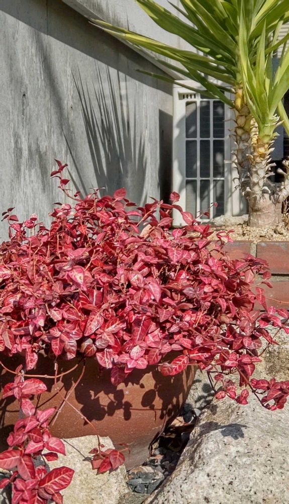 散策途中のお宅の玄関先のハツユキカズラ(初雪葛)が真っ赤に紅葉しています。