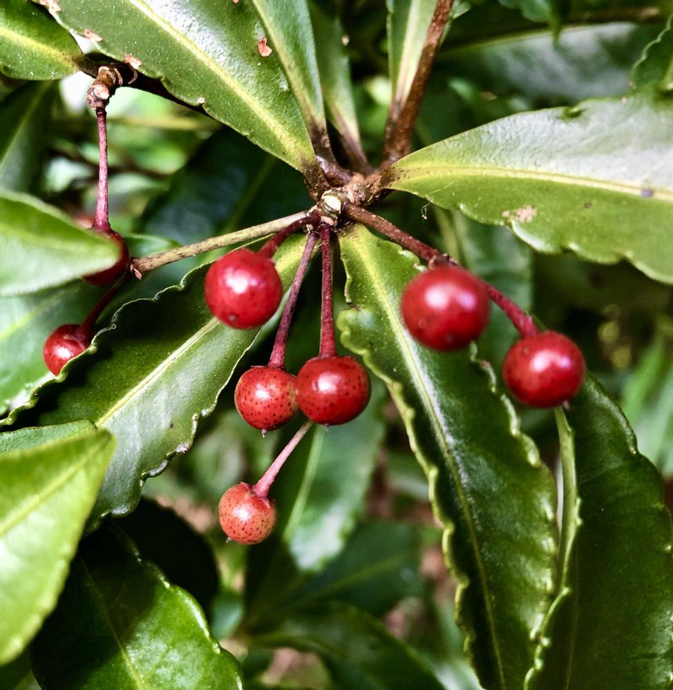 裏庭の万両の実がやっと赤くなりました🥰❤️❤️