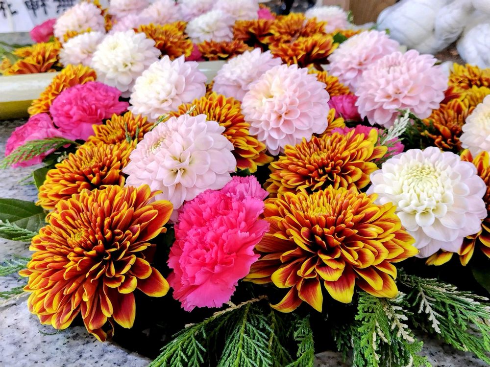 黄茶色系と淡いピンク色系のマムの組み合わせが素敵です✨🥳