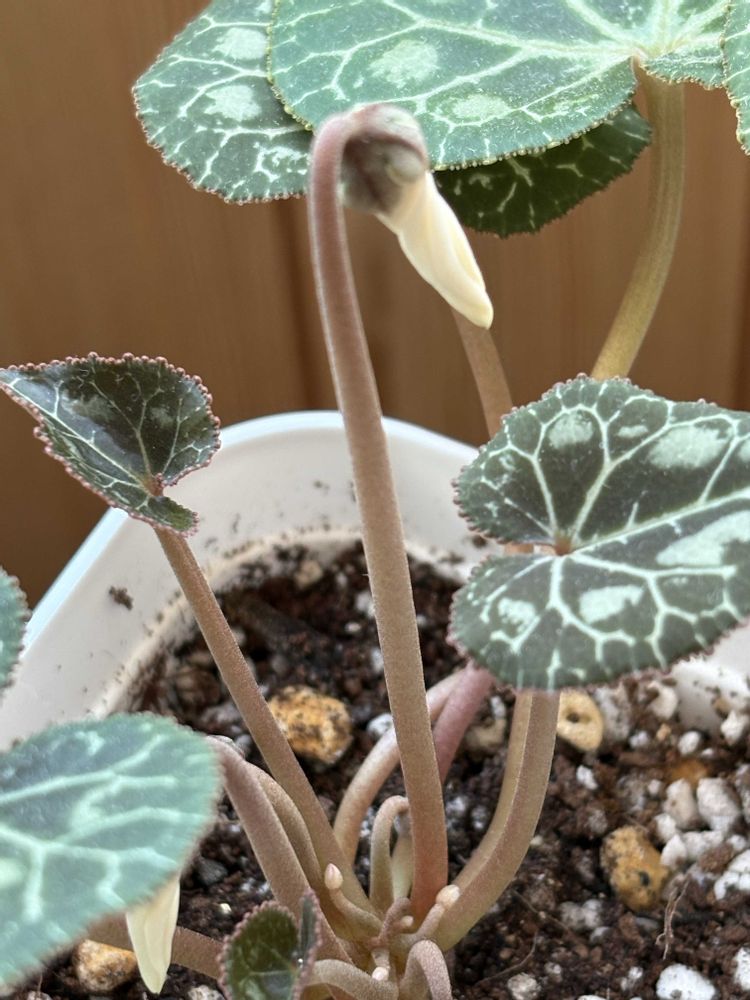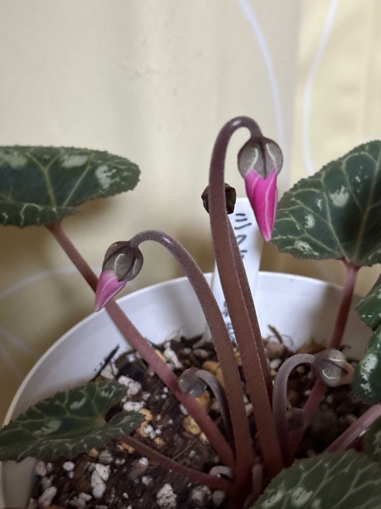 うちのシクラメン実生なのですが、9つあるうちの1つがピンク?色なんです まだ蕾なんですが😅
