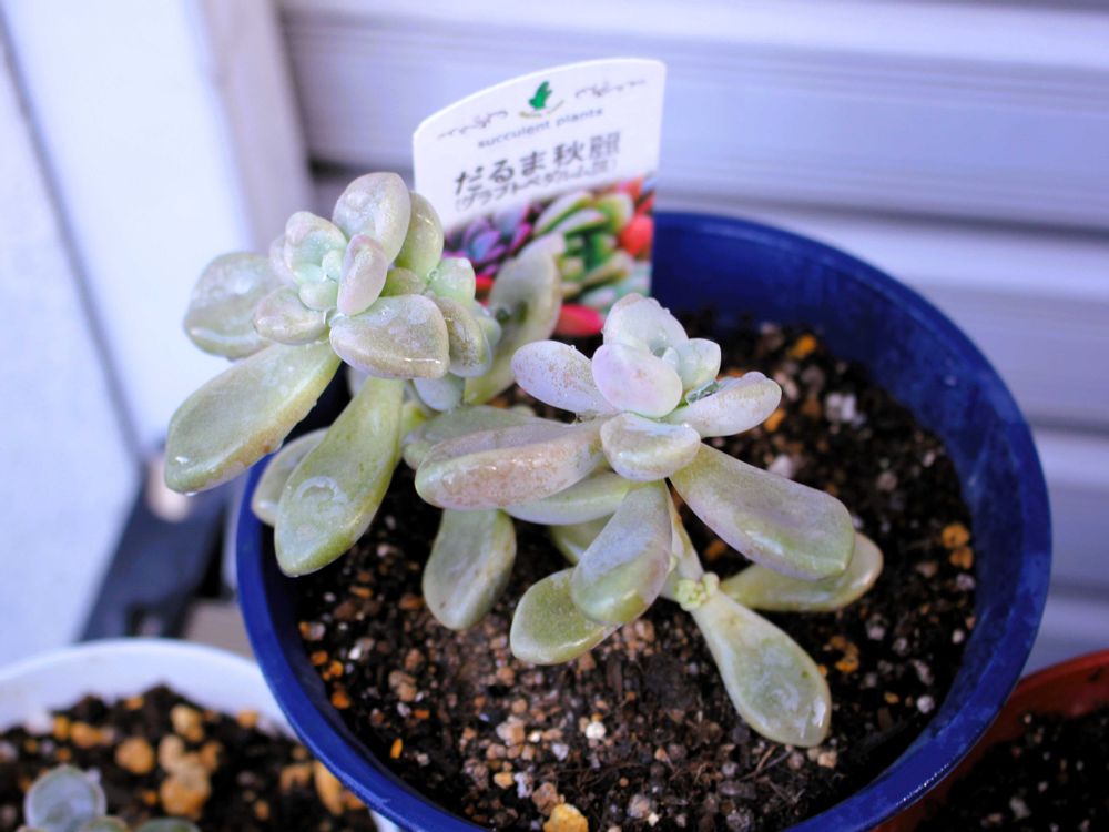 多肉ちゃんのだるま秋麗登場。ぷっくりとした葉と淡いピンクと紫が混ざった色合いが特徴ですねー。どんどん大きくして、さしめに挑戦。。¥^^