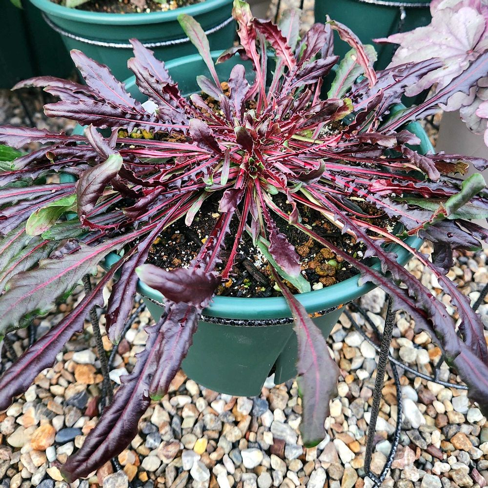 葉っぱが赤紫、赤いラインで素敵です。タンポポみたいにおもいっきり広がってきたのでびっくり~