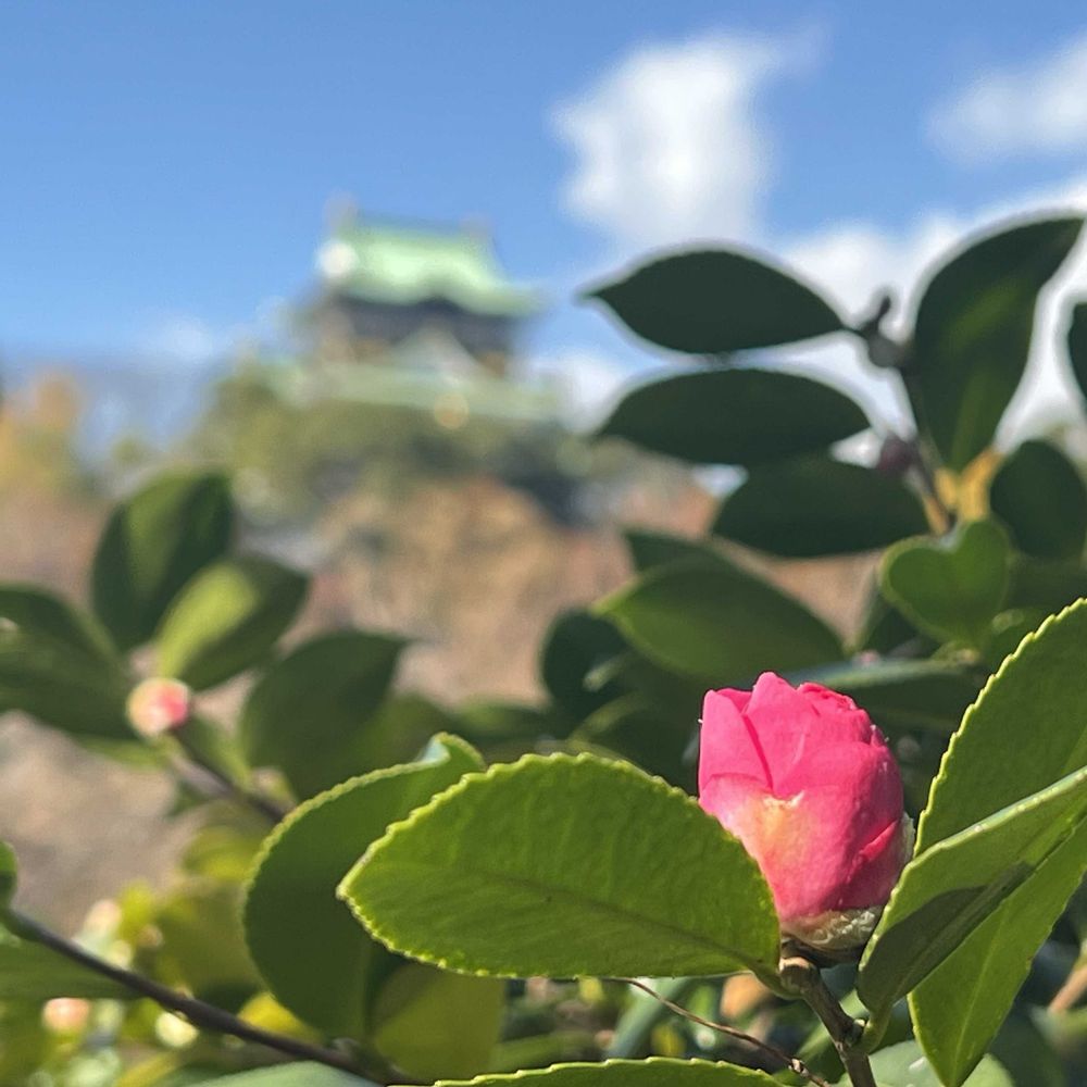 お城を見上げるサザンカの蕾 紅が可愛いですね🌺