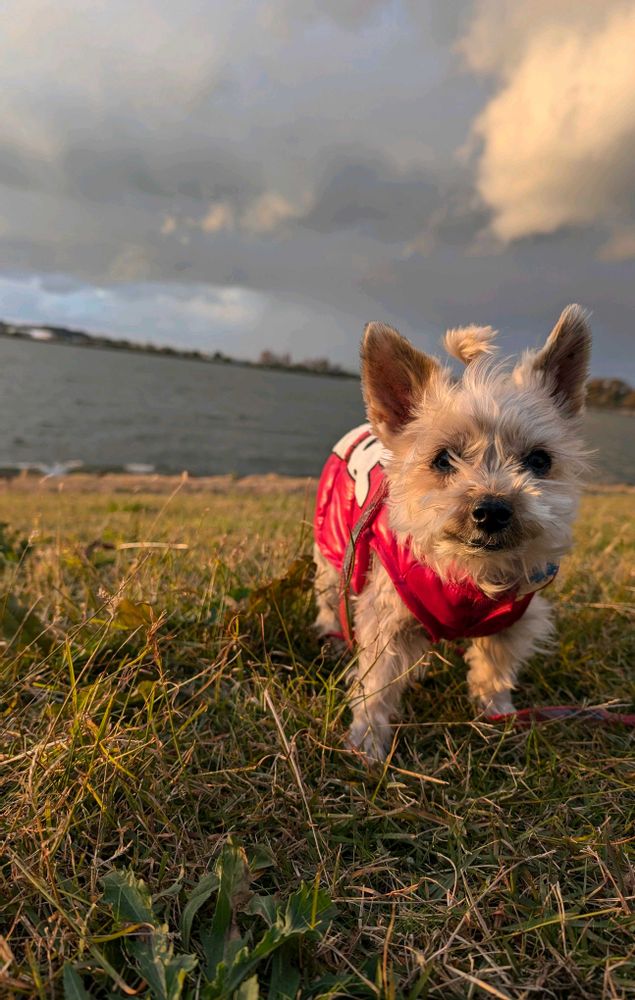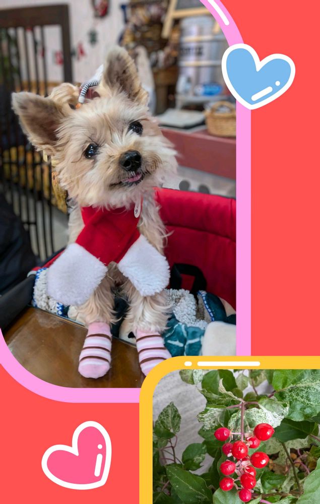 そらちゃんマフラー🧣と靴下🧦でオシャレして満足そうな笑み🐶サンタになりきってるみたい🎅🐶可愛い表情してますね〜🥰💕