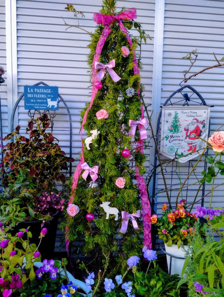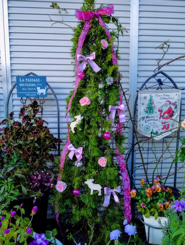 ピンクエリア💕の2mあるコニファーもXmas飾りしてソーラーのイルミネーションを付けました🌲