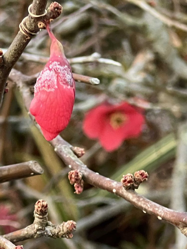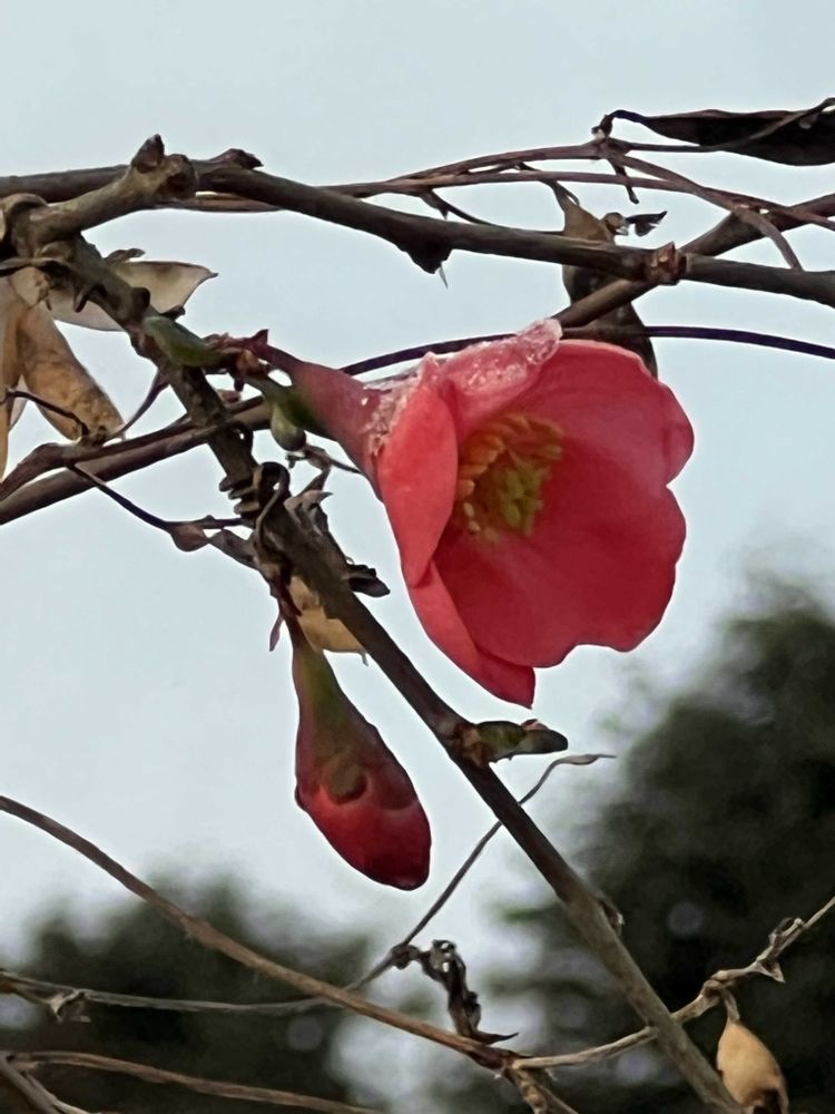 おはようございます🤗木瓜の花🌼綺麗だなぁ😀🎵と思っていたら0℃の中で咲いていたのですね😂蕾が霜みたいなのにおおわれて寒そうですね🥶❣️空☁もグレーに見えます👀❗アッコちゃんさん外に出る時は寒いからマフラー🧣巻いてね➰❤️🤗